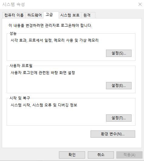 환경변수 등록 (내컴퓨터 > 고급시스템속성 > 고급)