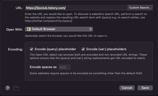 Keyword : 실행시킬 키워드 및 단축키 입니다. 저는 제 티스토리를 부르기 위하여 '티' 라고 설정했어요.