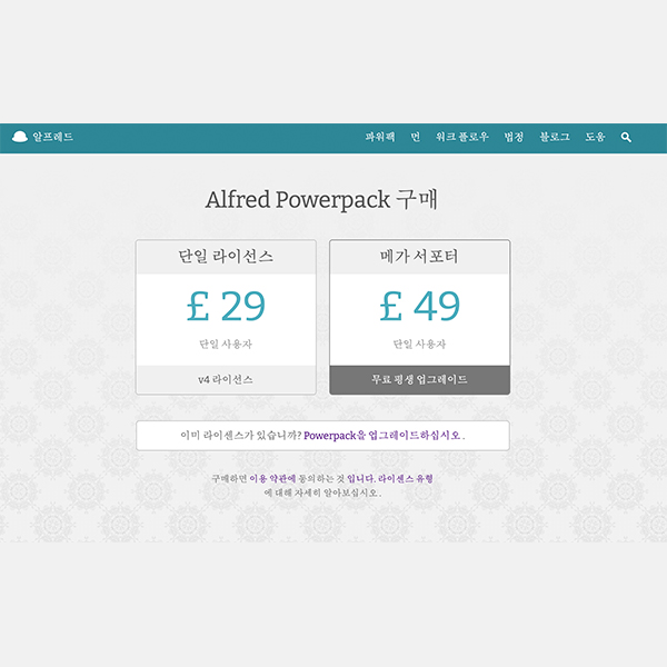 단일 라이선스 알프레드4 가격입니다.(29달러) 처음 알프레드를 구매할 때 단일 라이센스가 뭔지 궁금했던 기억이 있는데요. 단일 라이센스는 현재 사용되는 버전에 라이센스이며, 추후에 알프레드 업그레이드 버전 출시되어도 사용하지 못하고 구매했던 해당 버전만 사용이 가능합니다. 반대로 메가 서포터는 평생 업그레이드를 하며 사용할 수 있어요. 저는 올해 초 단일 라이선스를 구매하여 사용하고 있는데요. 알프레드4 기능만으로도 이미 충분히 잘 사용하고 있기 때문에 만약 구매 전 고민 중이라고 하신다면 단일 라이선스로 구매하여 사용해보시기 바랍니다.