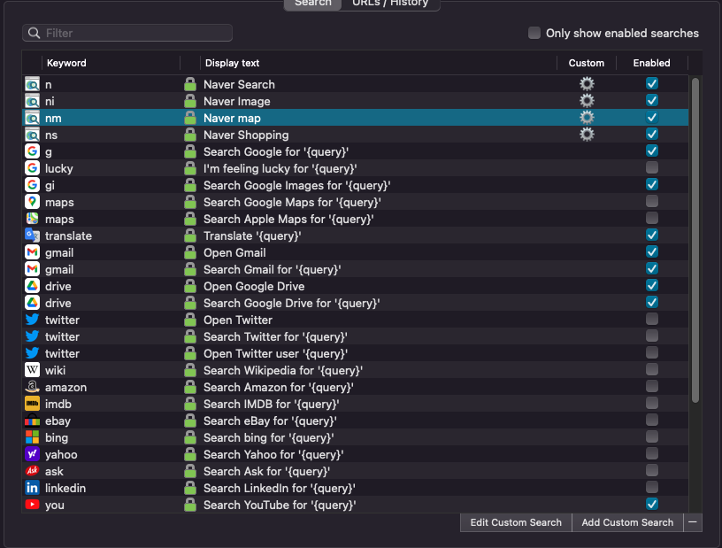 웹서치에 "Add Custom Search"를 누르고 검색 포털을 등록하여 나만의 커스텀화를 할 수 있습니다.