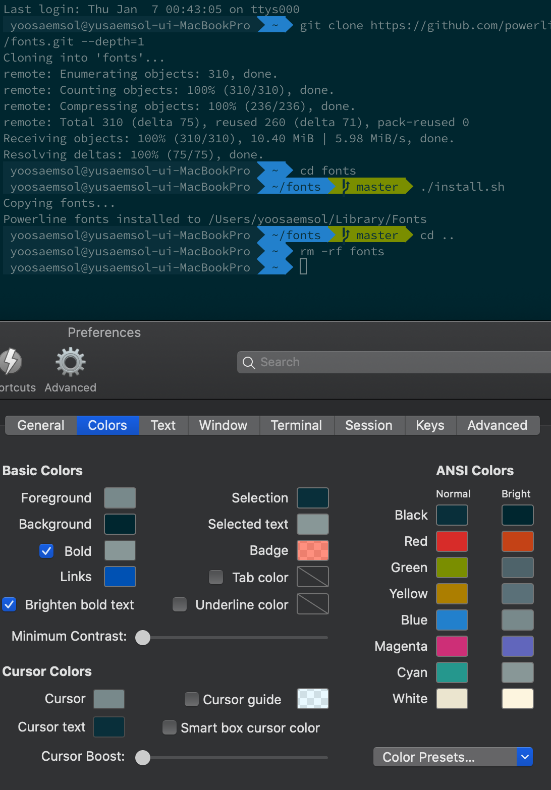 - 이번에는 다시 iTerm → Preferences → Profiles → Colors 로 이동한다.