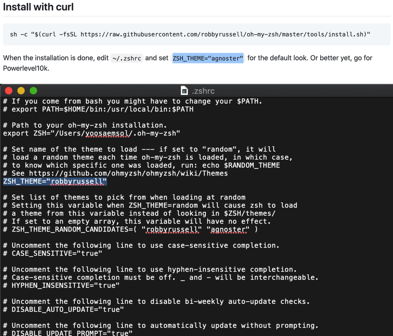 → 1번 에서는 Oh My Zsh 를 설치한것 뿐이기 때문에, 이제 원하는 테마로 설정해줘야한다.