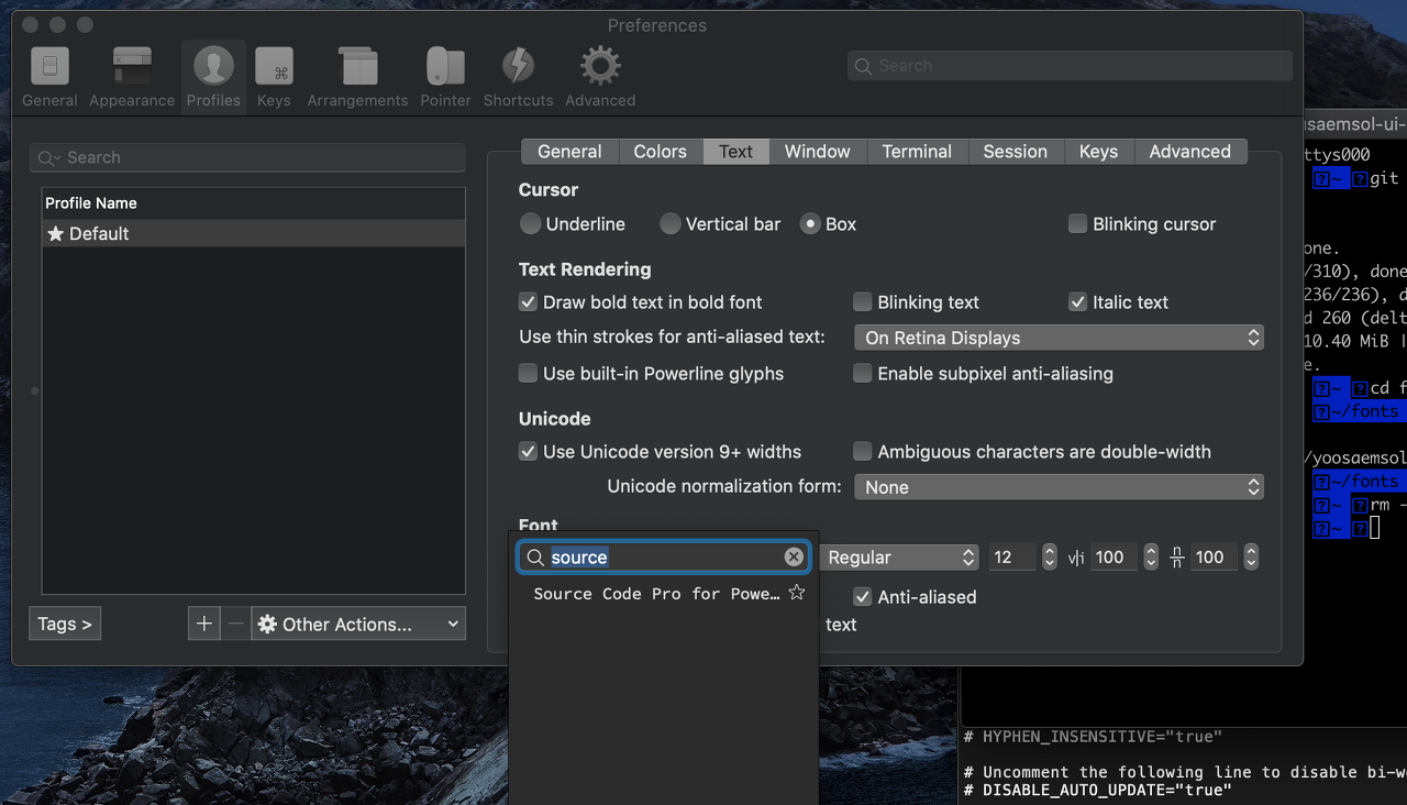 - Font 를 Source Code Pro for Powerline 로 설정해준다!