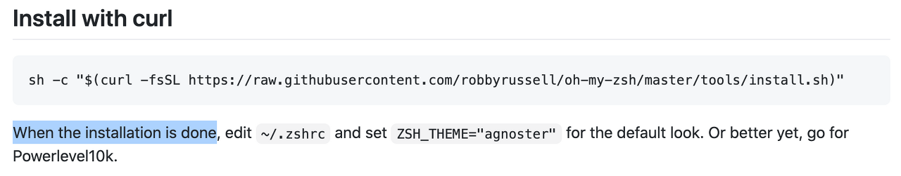 sh -c "$(curl -fsSL https://raw.githubusercontent.com/robbyrussell/oh-my-zsh/master/tools/install.sh)"그럼 몇초 뒤 설치 완료 ✨